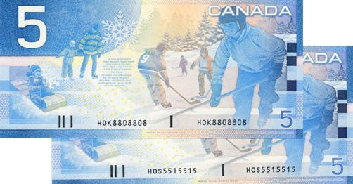 BANK OF CANADA. $5.00. 2005 Issue. BC-62b. No. HOK8808808; $5.00. 2005 Issue. BC-62b. No. HOS5515515. Lot of two (2) notes, both with two digit repeating serial number. Both Choice Unc.