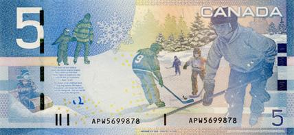 BANK OF CANADA. $5.00. 2006 Issue. BC-67b. No. APW5699878. A minor error note, with six or seven small white spots, (missing ink) on the player at right pants and sweater. Choice Unc.