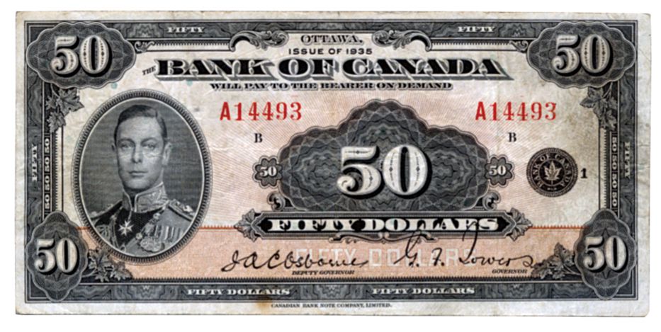BANK OF CANADA. $50.00. 1935 Issue. English Text. BC-13. No. A14493/B. PMG graded Very Fine-25. An excellent example.