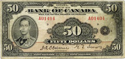 BANK OF CANADA. $50.00. 1935 Issue. English Text. Osborne. BC-13. No. A01404/D. PMG graded FINE-15.