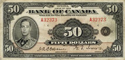 BANK OF CANADA. $50.00. 1935 Issue. English Text. Osborne. BC-13. No. A32373/C. PMG graded FINE-15.
