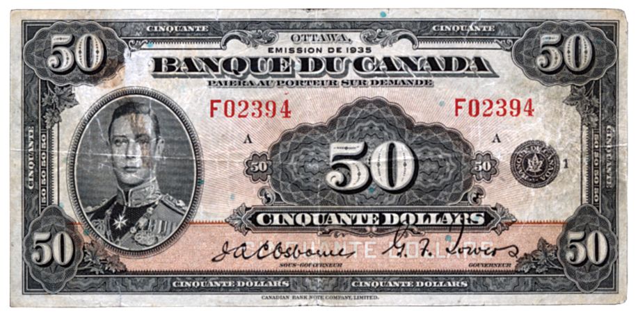 BANK OF CANADA. $50.00. 1935 Issue. French Text. BC-14. No. F02394/A. PMG graded Fine-15. A scarce example.