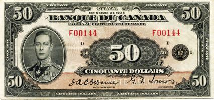 BANK OF CANADA. $50.00. 1935 Issue. French Text. Osborne. BC-14. No. F00144. CCCS graded Very Fine-30. Bright and vibrant.