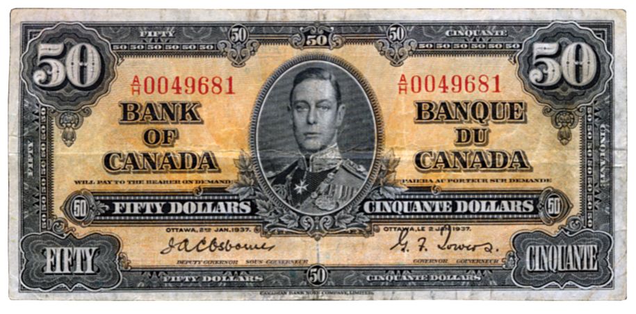 BANK OF CANADA. $50.00. 1937 Issue. BC-26a. Osborne- Towers. No. A/H0049681. PMG graded Very Fine-25.