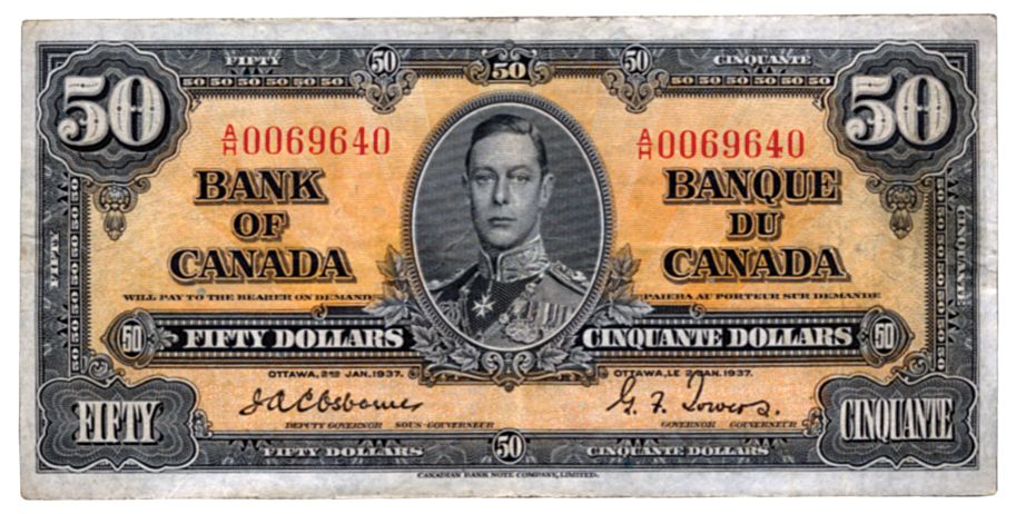 BANK OF CANADA. $50.00. 1937 Issue. BC-26a. Osborne-Towers. No. A/H0069640. PMG graded Very Fine-35. EPQ. Crisp and original. The appearance of an extra fine note.