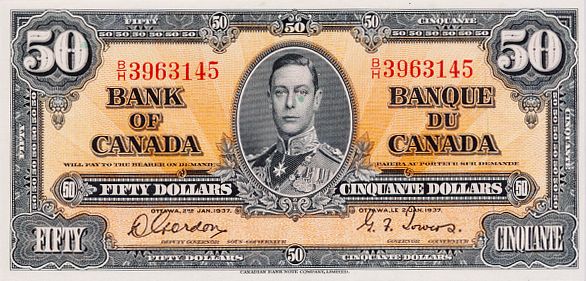 BANK OF CANADA. $50.00. 1937 Issue. BC-26b. Gordon- Towers. No. B/H3963145. BCS graded Unc-60, (original).