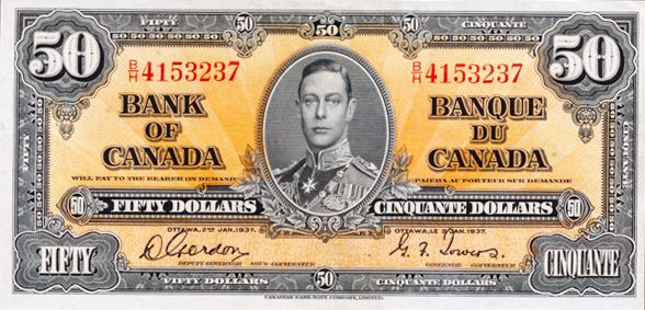BANK OF CANADA. $50.00. 1937 Issue. BC-26b. Gordon- Towers. No. B/H4153237. PCGS graded AU-58PPQ.