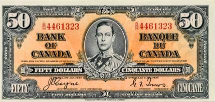 BANK OF CANADA. $50.00. 1937 Issue. BC-26c. No. B/H4461323. About Extra Fine.
