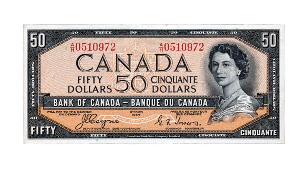 BANK OF CANADA. $50.00. 1954 Issue. BC-34a. Coyne-Towers, ‘Devil’s Face’. No. A/H0510972. PMG graded Choice Unc-64. A very nice example. Near Gem. Ex. Thomas M. Flynn collection.