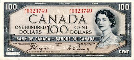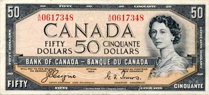 BANK OF CANADA. $50.00. 1954 Issue. BC-34a. ‘Devil’s Face’. Coyne-Towers. No. A/H0617348. VG-8; $100.00. 1954 Issue. BC-35a. No. A/J0323749. Very Fine-20. Lot of two (2) Devil’s Face note.