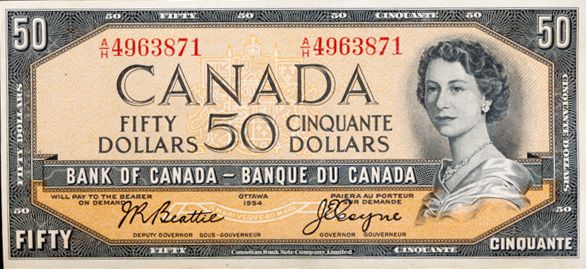 BANK OF CANADA. $50.00. 1954 Issue. BC-42a. Beattie-Coyne. Modified. No. A/H4963871. CCCS graded Unc-60.