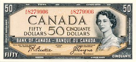 BANK OF CANADA. $50.00. 1954 Issue. BC-42a. Modified. Beattie-Coyne. No. A/H8279906. Choice Unc.