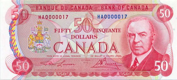 BANK OF CANADA. $50.00. 1975 Issue. BC-51a. Lawson-Bouey. No. HA0000017. A Low Serial numbered note. Choice Unc. Ex. TICF, Nov. 15-16, 2002. Lot #498.