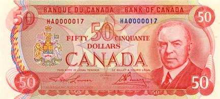 BANK OF CANADA. $50.00. 1975 Issue. BC-51a. Lawson-Bouey. No. HA0000017. A Low Serial numbered note. Choice Unc-63. Ex. TICF. Nov. 15-16, 2002. Lot #497.