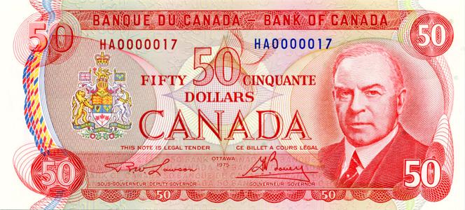 BANK OF CANADA. $50.00. 1975 Issue. BC-51a. Lawson-Bouey. No. HA0000017. A Low Serial numbered note. Choice Unc-63. Ex. TICF. Nov. 15-16, 2002. Lot #497.