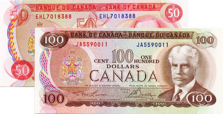BANK OF CANADA. $50.00. 1975 Issue. BC-51b. Crow-Bouey. No. EHL7018388. Unc; $100.00. 1975 Issue. BC-52a. Lawson-Bouey. No. JA5590011. AU. Lot of two (2) notes.