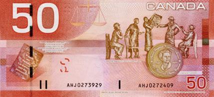 BANK OF CANADA. $50.00. 2004 Issue. BC-65a. (CH-E-15-iii). A mismatched serial number error, with three internal digits mis-matched. No. AHJ0273939 and AHJ0272409. EF. A scarce error on a high denomination note.
