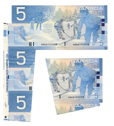 BANK OF CANADA. A major multiple fold and cutting error. CH24-iii. $5.00. 2002 Issue. BC-62a-i. Knight-Dodge. CBN. One full note at top, but parts of two additional notes attached at bottom right, plus half of the left note at below the main note, separated from the others. No. HNG6192918 & NHG6192919, plus a portion of a third note without serial number. A rare three note error.