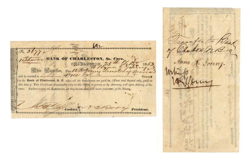 1853, South Carolina. Stock certificate for 1 share. Black. Issued to A.R. Young and witnessed on verso by Henry E. Young. Young was a Major - Judge Advocate on Lee's staff; he turned down Judge Advocate for the CS Army and the rank of Colonel so that he could ride with Lee as he felt it a greater honor. Young signed the same parole as Lee at Appamottox. Age toning, fine. Cut cancelled with all paper intact.