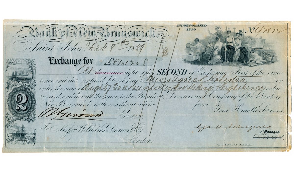 BANK OF NEW BRUNSWICK. Second of Exchange. Feb. 8, 1889. Eighty-one Pounds (and change). Very Fine.