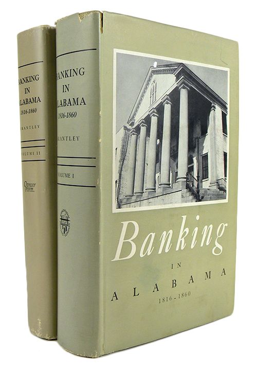 Brantley, William H. BANKING IN ALABAMA, 1816-1860. Two volumes. Privately printed, 1961 and 1967. 8vo, original matching tan cloth printed in green and gilt; jackets. Frontispiece, xxi, (1), 500 pages; frontispiece, xiii, (3), 420 pages; both volumes illustrated throughout. Gift inscriptions; near fine. The work of an amateur historian, these are impressive volumes, highly detailed and focused. Includes information on bank notes. Sullivan 1.