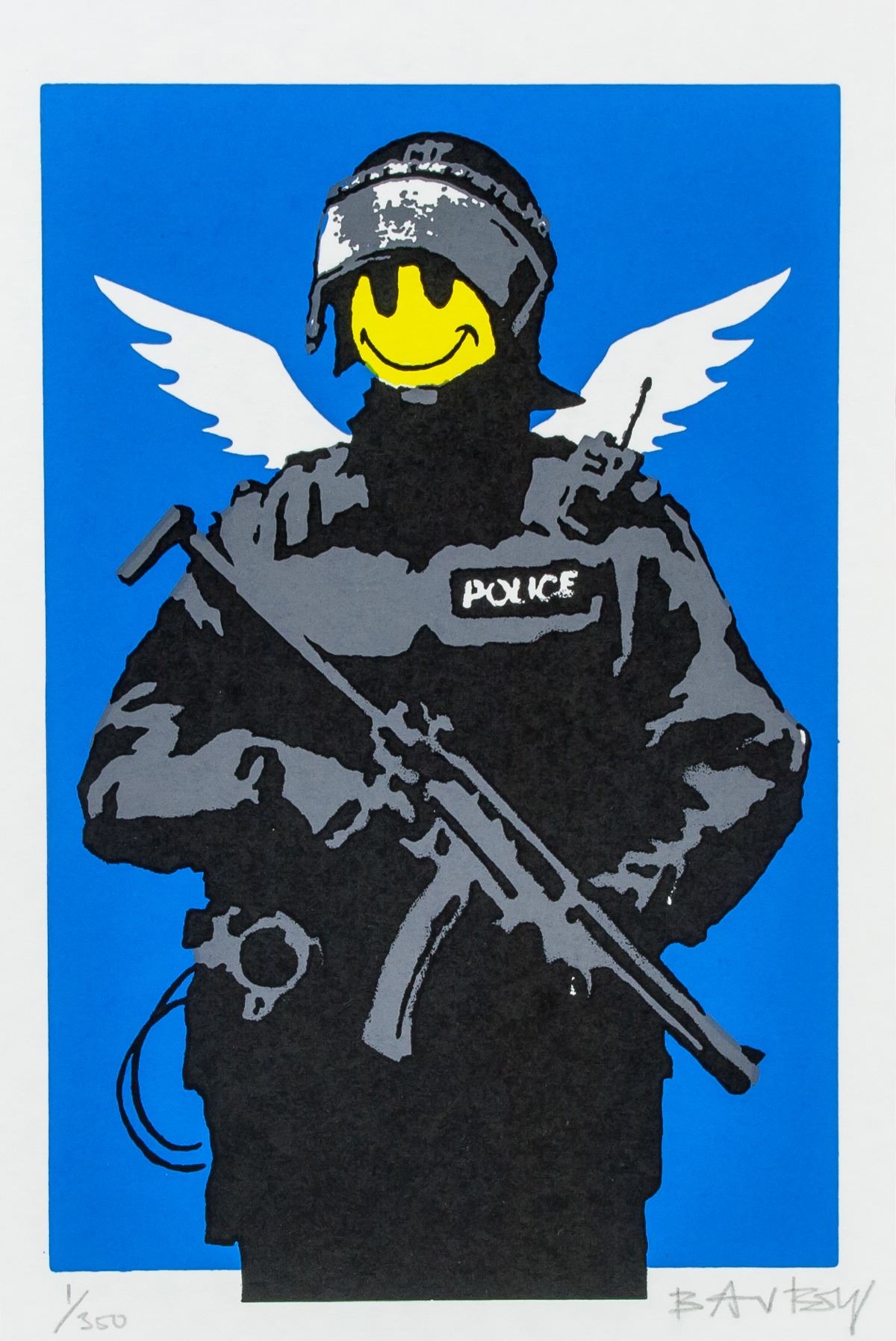 Lithograph on paper. Featuring a SWAT member with happy face. Signed and attr. Banksy (British, born 1974) on the lower right corner with series 1/250 in pencil with BANKSY stamped and gallery notation inscribed in pencil on verso. 30 x 20 cm (11.8 x 7.9 inches). Banksy is a British street artist and activist who, despite his international fame, has maintained an anonymous identity. Aimed as a form of cultural criticism, the artist often targets established social and political agendas with his witty illustrations produced with stencils and spray paint. “The art world is the biggest joke,” he said. “It’s a rest home of the over privileged, the pretentious, and the weak.” Although details of the artist’s life are largely unknown, it is thought that Banksy was born in Bristol, United Kingdom, c. 1974, starting his career as a graffiti artist in the city. Better Out Than In, Banksy’s month-long residency in New York during October 2013, featured a man hawking the artist’s paintings for $60 a piece outside Central Park. In 2015, Banksy opened Dismaland Bemusement Park, a temporary art exhibition that functioned as a theme park. After a 36-day run, its workers and materials were sent to the Calais migrant camp to build additional housing. Despite the artist’s aversion to the art world, he continues to produce works on canvas as well as prints and T-shirts. The question as to who Banksy is, continued to reach the headlines when in 2017 Robert Del Naja, the singer of the band Massive Attack was falsely rumored to be Banksy. The artist currently lives and works in the United Kingdom. PROVENANCE: Private collection (Toronto, Canada)