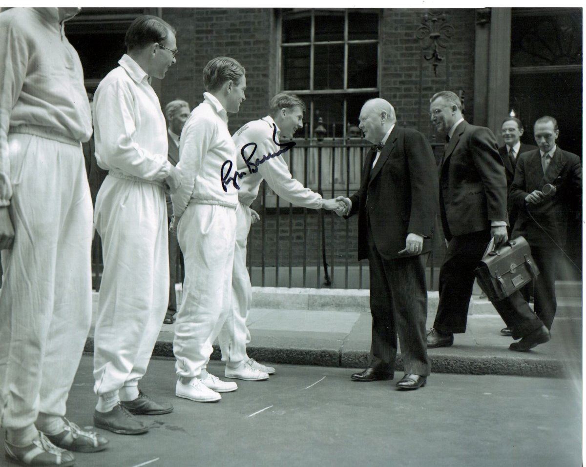 Roger Bannister signed photo. After he was met by Prime Minister Winston Churchill. 10x8 inches.On the morning of May 6, 1954, it was raining steadily across the south of England and the wind was blowing hard. Roger Bannister’s mood matched the skies above. Then a medical student, he was also Britain’s best middle-distance runner, whom many people were tipping to become the first man in the world to run a mile in less than four minutes. But he was also the man everyone had predicted to win gold at the Olympic Games in Helsinki two years previously. He came fourth. The headlines screamed he was a failure. The memory of Helsinki exacerbated his state of mind. He knew that the wind would slow him down by about a second a lap -- and the mile was four laps long. Sir Roger describes the laps unfolding "almost like the evolving of a Greek tragedy, or a triumph, in which everything is encapsulated in that short period of time”.