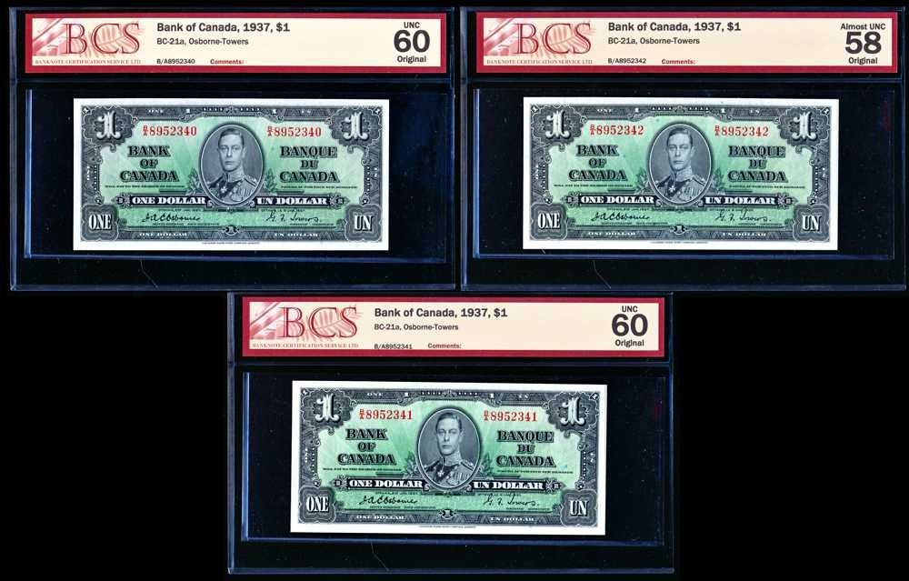 Lot of 3 Bank of Canada 1937 $1 Osborne-Towers BCS UNC 60 and 58 Consecutive Serial Numbers