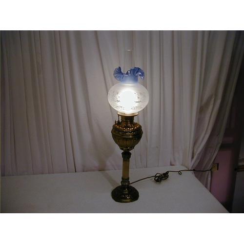 Very beautiful lamp that has been converted from oil to electric. The lampshade is a very beautiful etched frost with a blue ruffle top. This has a marble stem, there is a defect in the marble but it is solid. This lamp has great detail in the brass base and in the container that use to hold the oil is in great condition. This beautiful lamp and would make a great addition to any room with blues in it. Measurements: The lamp is 31" tall total and the base is 20 1/2? tall, and around it is 7?. The tulip shade is 9? tall and around it is 8? and the chimney shade is 11 3/4? tall and around it is 3 1/2?. The weight is 8 lbs. <p>We do have more photographs that we can email if you are interested. <p>We advise using Greyhound instead of using DHL or UPS due to items being damaged by DHL & UPS. Our packing is very good and adequate. We will ship by DHL & UPS at the customer request. Please let us know what shipping arrangements you would like when making a purchase. Please provide your name, address and phone number along with an email address so that we can advice you of how much the shipping & handling will be. We can only give shipping quotes during regular business hours, Monday through Friday, 9:00 am to 5:00 pm CST, except on holidays. Thank you for shopping with us. We do strive to offer quality items but all antique and vintage items will have some imperfections due to age and normal use. We do try to include this in our description or the photographs. Thank you for shopping ...
