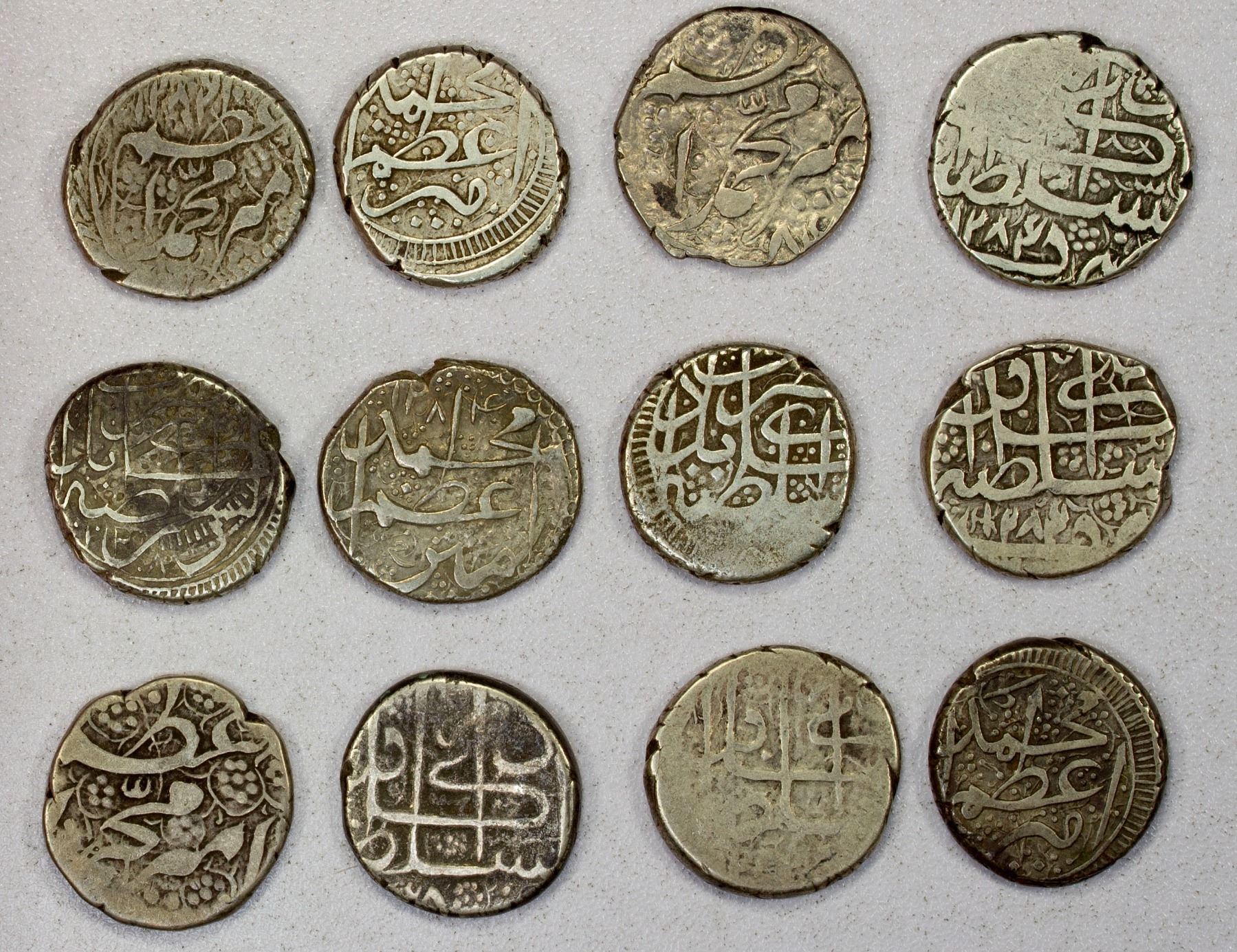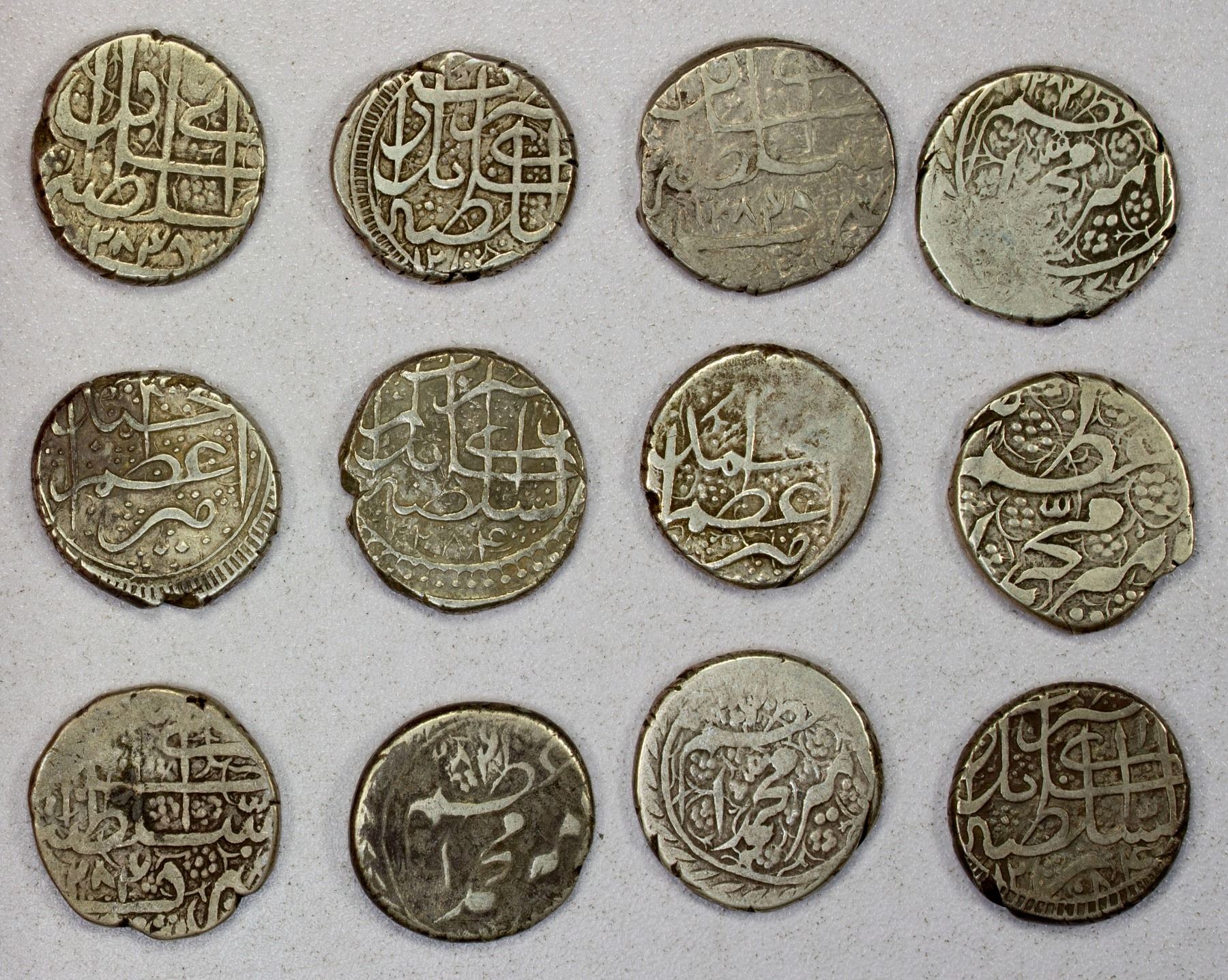 BARAKZAI: Muhammad A'zam, 1866-1868, LOT of 12 silver dirhams, type A-3172 (including 5 pcs of KM-508.1 and 7 or KM-508.2), about half with legible date AH1284, average Fine condition; retail value $300, lot of 12 pieces.