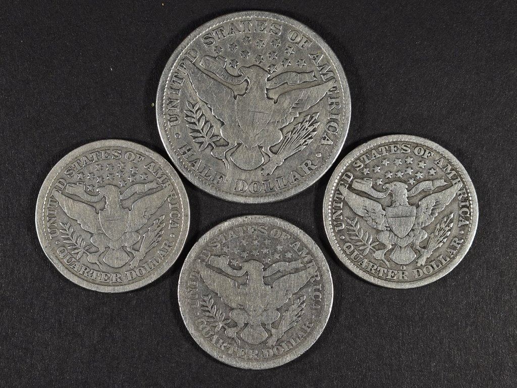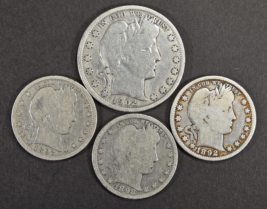 1892, 92-O, 98 QUARTERS ALL G4 & 1902 HALF G4 ESTIMATE $50 - $70.