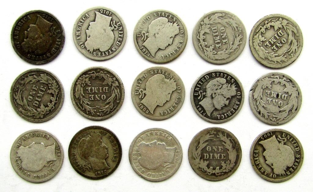 BARBER DIME LOT of 15 COINS