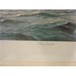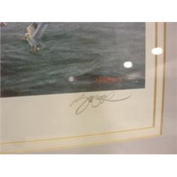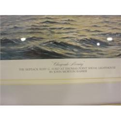 BARBER, JOHN MORTON SKIPJACK PRINT. Titled "Chesapeake Morning-The Skipjack Ruby G. Ford at Thomas Point Shoal Lighthouse-by John Morton Barber". Signed in lower right. Numbered 1331/1450 in lower left. 30" x 21.75" framed.