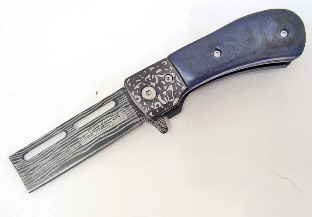 3-1/2" closed. 2-1/4" black razor blade with damascus pattern. 3-1-2" black/blue pearl style acrylic handle. Includes pocket clip. TF-728BL