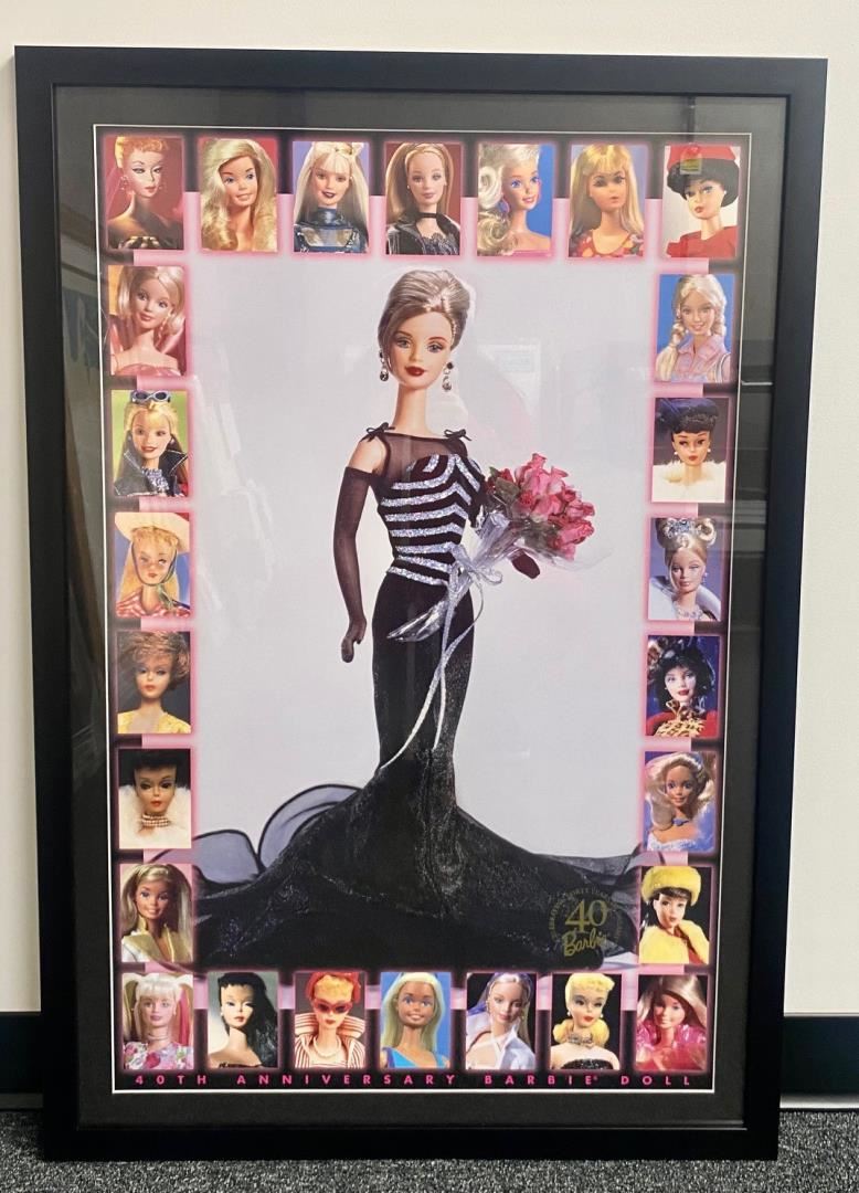 A newly framed Vintage Barbie Poster commemorating 40 years of Barbie in 1999. NEW Frame is 40.5"x27.5". Poster shows a little wear on the edge but otherwise looks great .
