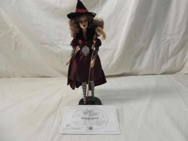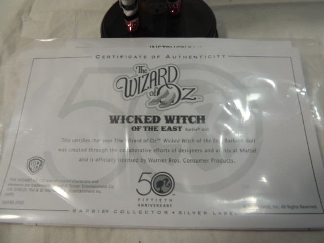 NICE BARBIE WIZARD OF OZ WICKED WITCH OF THE EAST BARBIE ISSUED FOR THE 50TH ANNIVERSARY OF BARBIE. SILVER LABEL. BUILT IN SPEECH MODULE WITH ACTUAL SOUNDTRACK FROM THE MOVIE. COMPLETE WITH COA, AS SHOWN.