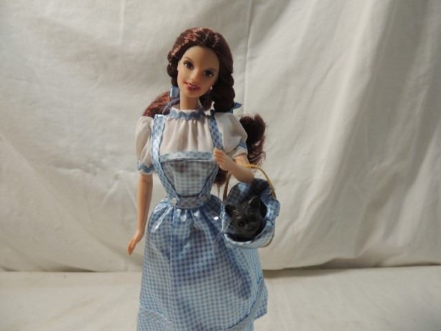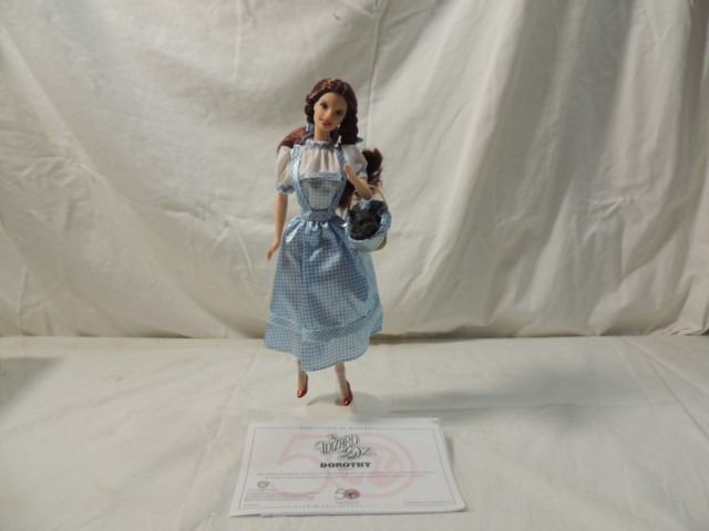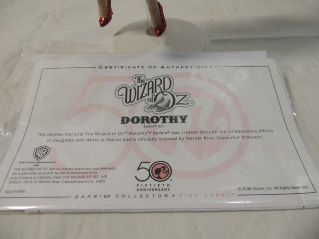 NICE BARBIE WIZARD OF OZ DOROTHY BARBIE ISSUED FOR THE 50TH ANNIVERSARY OF BARBIE. PINK LABEL. BUILT IN SPEECH MODULE WITH ACTUAL SOUNDTRACK FROM THE MOVIE. COMPLETE WITH COA, AS SHOWN.