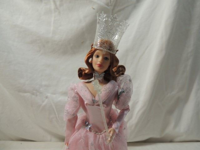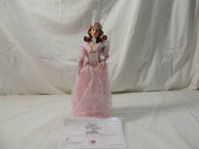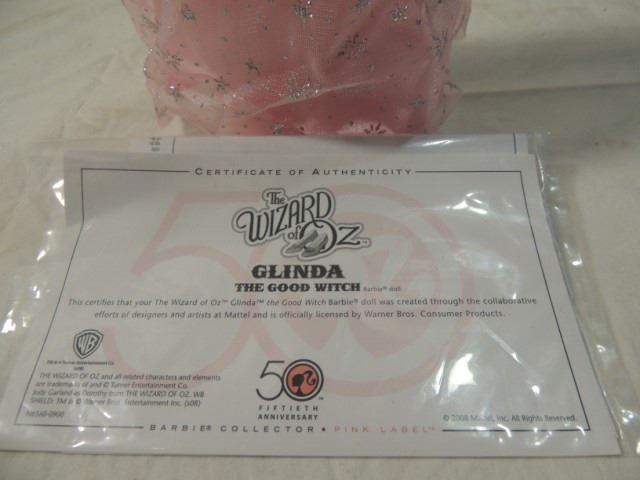 NICE BARBIE WIZARD OF OZ GLINDA THE GOOD WITCH BARBIE ISSUED FOR THE 50TH ANNIVERSARY OF BARBIE. PINK LABEL. BUILT IN SPEECH MODULE WITH ACTUAL SOUNDTRACK FROM THE MOVIE. COMPLETE WITH COA, AS SHOWN.