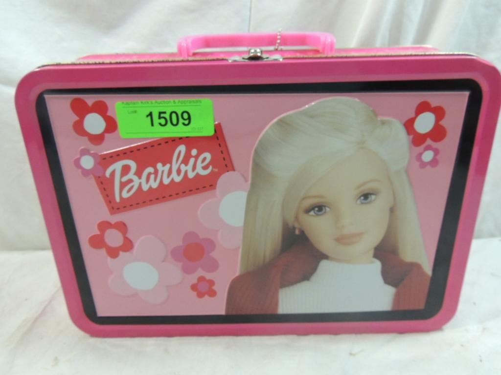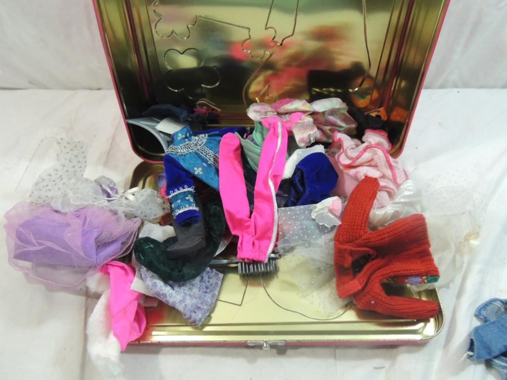BARBIE CLOTHES, BARBIE OUTFITS, ASSORTED ACCESSORIES, TRAVEL CASE, LARGE LUNCH BOX STYLE BOX, AS SHOWN SEE PHOTO FOR MORE DETAILS.