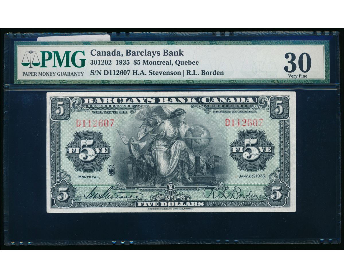 BARCLAYS BANK (CANADA). $5.00. JANY, 2ND 1935. CH-30-12-02. Stevenson-Borden. Series 'D'. No.112607. PMG graded Very Fine-30.