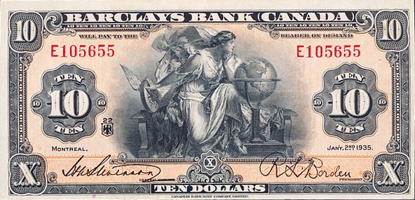 BARCLAYS BANK (CANADA). $10.00. Jan. 3, 1935. CH-30-12-06. No. E105655. Borden, right. PMG graded Ve