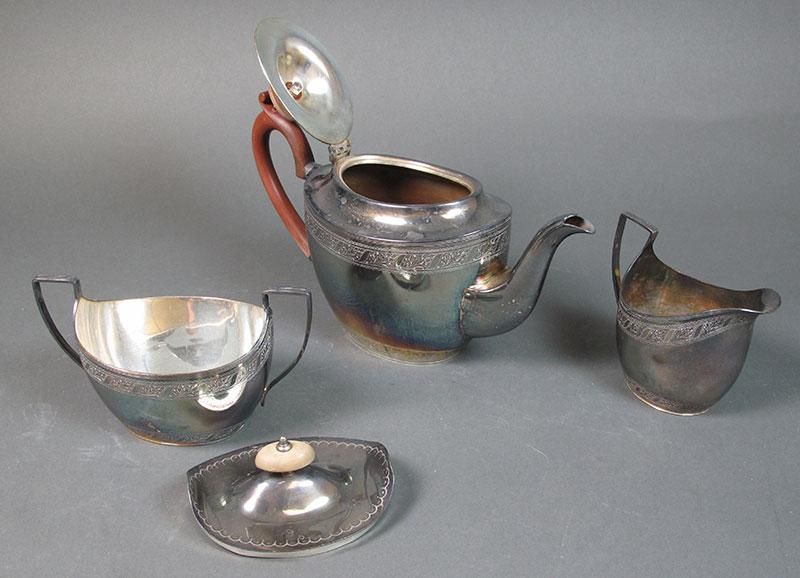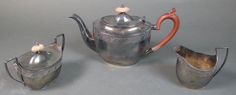 -comprised of teapot, covered sugar & open cream. Marked with the Menorah.