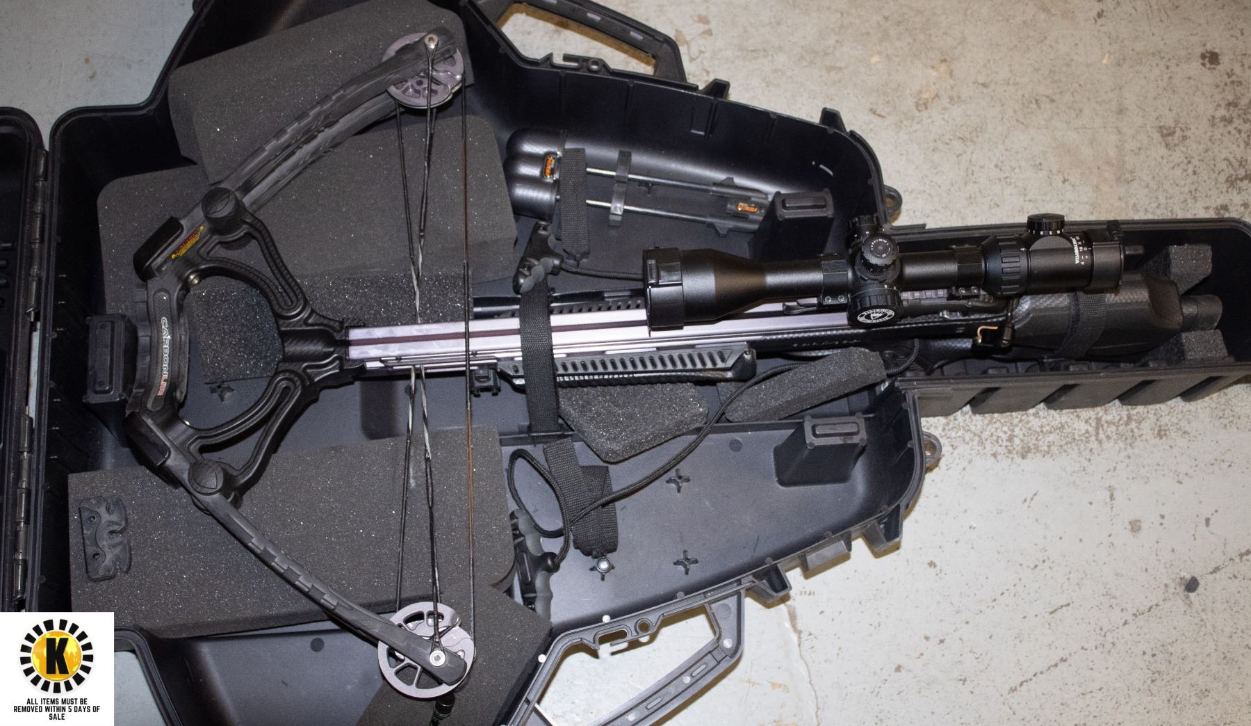 COMES WITH PLANO HARDCASE, 400 FPS. 185 DRAW WEIGHT, 151 LBS KINETIC ENERGY. 38" LONG, 24" WIDE. COMES WITH ROPE COCKING DEVICE, ARROWS/BOLTS AND CROSSBOW WAX