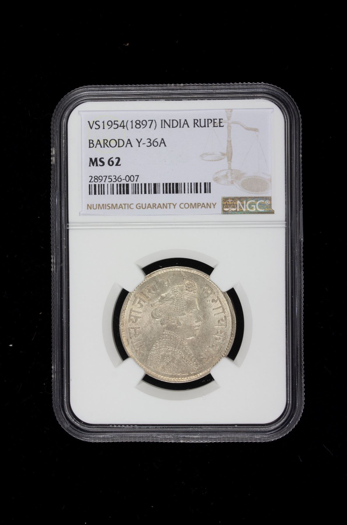 BARODA: Savaji Rao III, 1875-1938, AR rupee, VS1954, Y-36a, better date for this type, lovely example! NGC graded MS62.