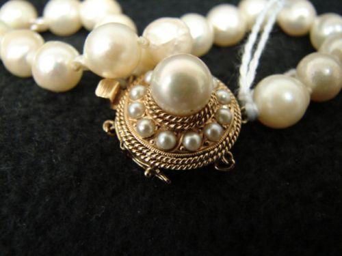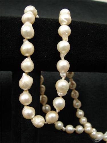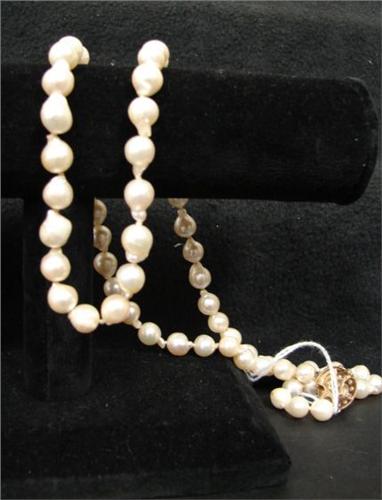 BAROQUE PEARL NECKLACE. Has (8) 8 ½ mm pearls, good luster, with 18mm 14KT yellow gold pearl clasp. 26" L. 54.6 grams wt. Has CAGA appraisal.