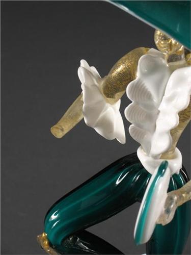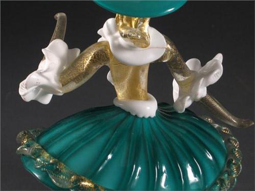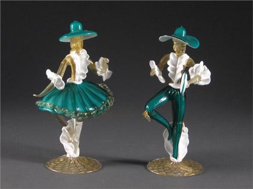Pair Barovier and Toso unsigned figurines of white, turquoise and adventurine flecked glass. Hands and cymbals of male figure have been broken, one is glued back on and the other is loose (present). Mid-20th c.