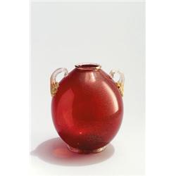 farbloses Glas mit rotem Innenüberfang und Goldfolieneinschlüssen. Auf flachem Standring ovoide, stark gebauchte Form mit appliziertem Henkelpaar. H.: 16,5 cm. Unbezeichnet. 1930er/40er Jahre.