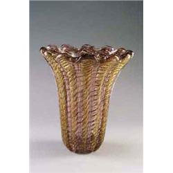 BAROVIER & TOSO, Murano Vase, Zebrato, farbloses Glas mit violetten und goldfarbenen Einschlüssen. Auf rundem Stand kelchförmig nach oben aufsteigend mit vertikal gewulsteter Wandung und gewellter Mündung. H.: 25 cm. Unbezeichnet. 1950er Jahre Lit.: Heiremans, Marc, Murano Glas uit de twintigste eeuw, Ausst.kat. Museum voor Sierkunst en Vormgeving, Gent 1996,S. 79, Abb. 86 (zun Dekor)