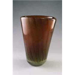 BAROVIER & TOSO, Murano Vase, farbloses Glas. Bernsteinfarbener Innenüberfang mit Luftblasen- und Goldfolieneinschlüssen. Über rundem Stand ins Oval gedrückt, nach oben erweitert. H.: 30,5 cm. Unbezeichnet. 1940er Jahre
