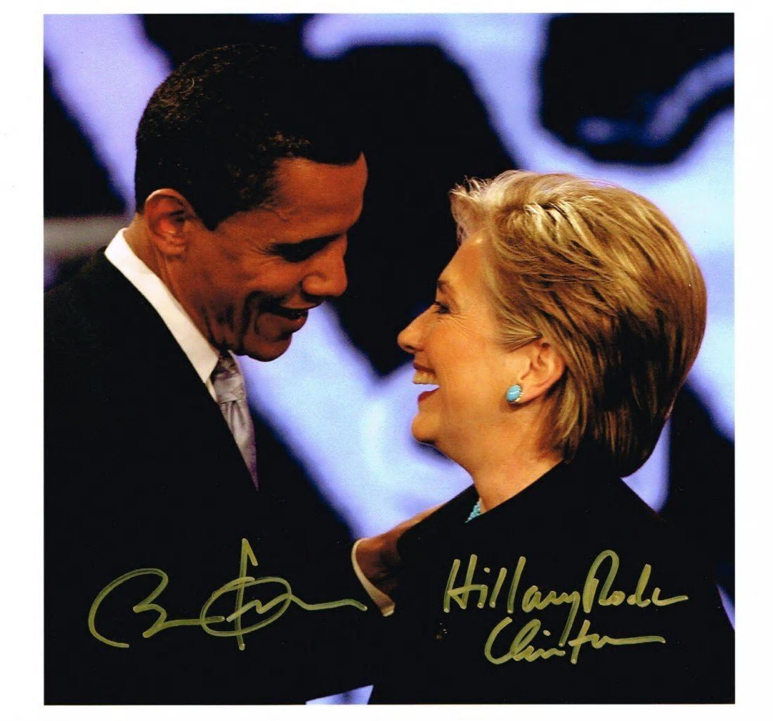 A photo of the President of the United States along with the presidential runner Hillary Clinton. The photo measures 8x8 inches.